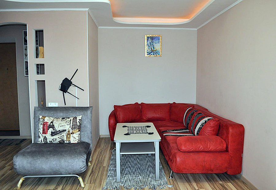 В квартире есть просторная комната, хорошая мебель и оборудованная кухня.